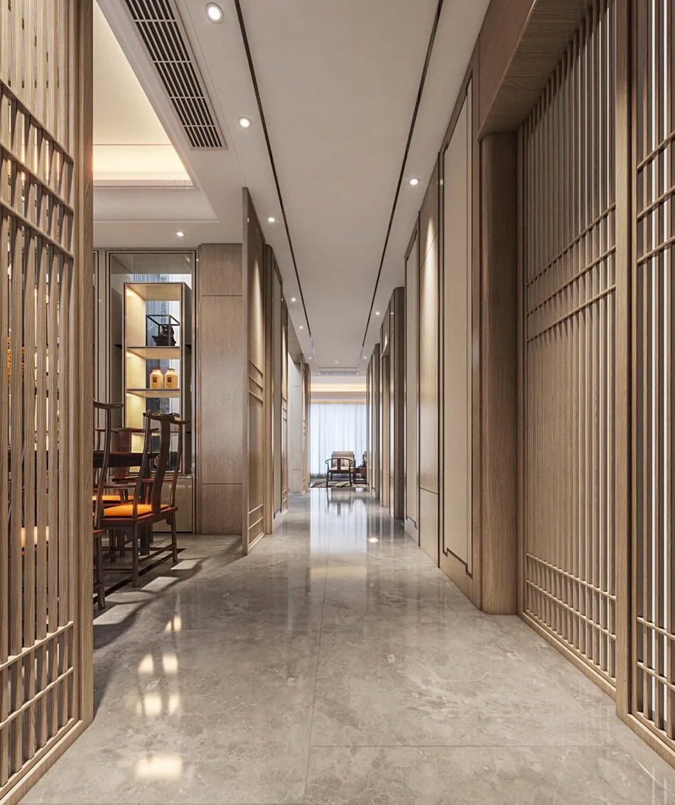 木质栅格分割走廊动线,透而未透的状态让整体空间藕断丝连,走廊尽头的客厅透露出温暖与礼序,生气而悠长。
