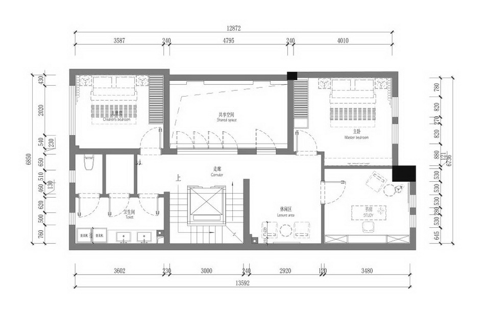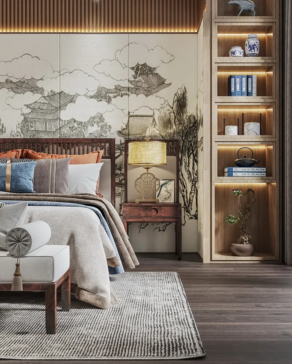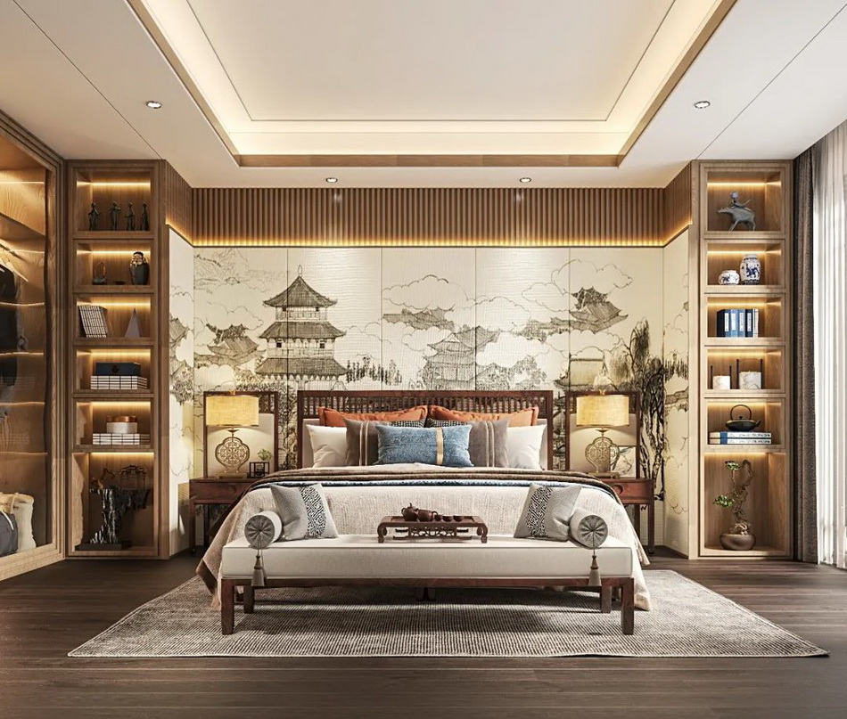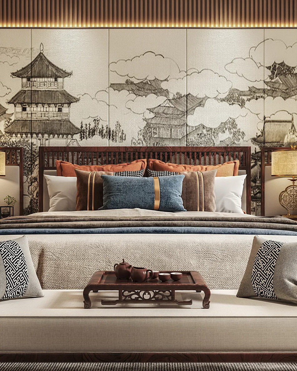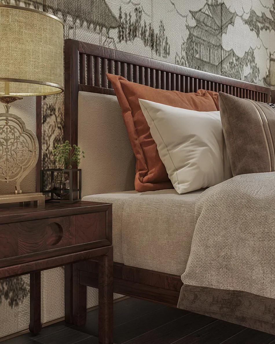 低调内敛的主卧设计,以金色衬托浑浑古建壁画艺术,将传统文化的细腻温度绘于空间。再饰以古韵悠然的灯具,床屏与床头背景墙的栅格元素相互呼应,恰到好处的东方印象便在此显露了,宁静惬意,以无声胜有声。