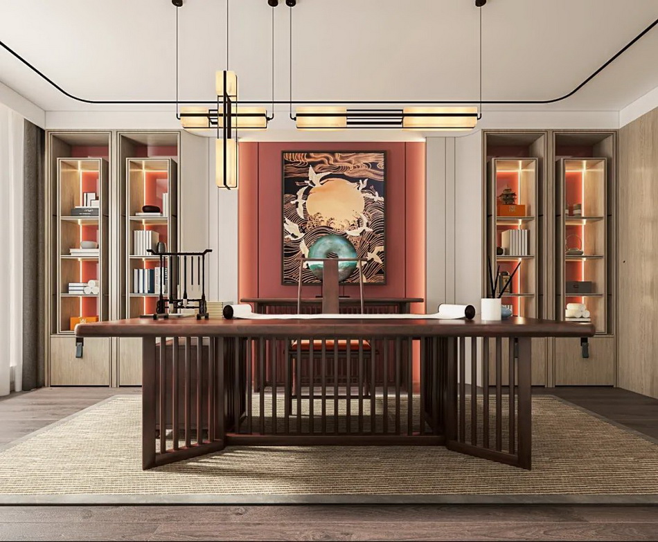 沉稳简雅的红木沙发由红木+布艺软包结合呈现,配合新中式灯具与圈椅,链接起空间的艺术性,将《宋史》中所提及的“耳目清旷,不设机关以待人,心安闲而体舒放”的自在感纳入空间。