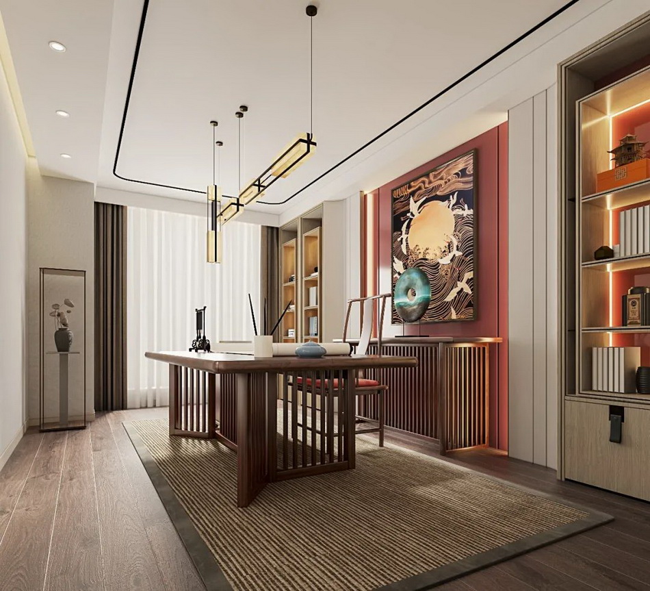 书籍藏物整齐列架,倚墙而立,文竹摆件、卷帙画幅,挥洒一纸墨香晕染画中,令人在这隅沉浸式的精神之地中随心享受。
