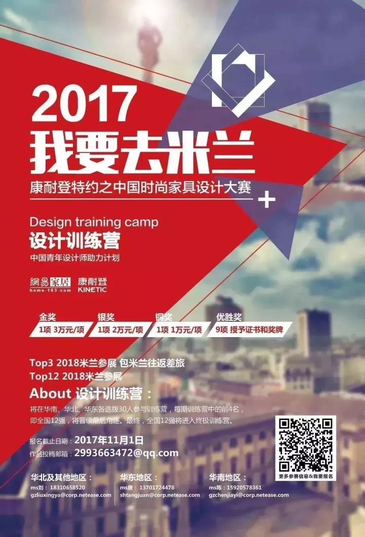 中国设计的未来,在于青年设计力量。凝聚青年力量,促进中国设计发展,这正是网易设计与康耐登的举办此次“我要去米兰—2017设计训练营”计划的初衷。心有多大,舞台就有多大,只要你有梦想、有作品,世界米兰的舞台,任你发挥,2017中国时尚家具设计大赛等你来!