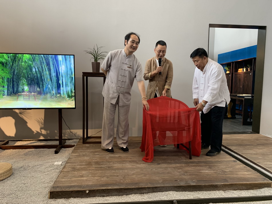 作为本次展会的重磅之作,璞睿在开幕当天隆重推出合椅后的又一力作——梳椅,梳椅设计师——刘丞翰先生、吴寒老师以及上海非物质文化传承人,洪氏古琴第十八代传人,著名斫琴匠人洪崇岩共同为梳椅首发揭幕。