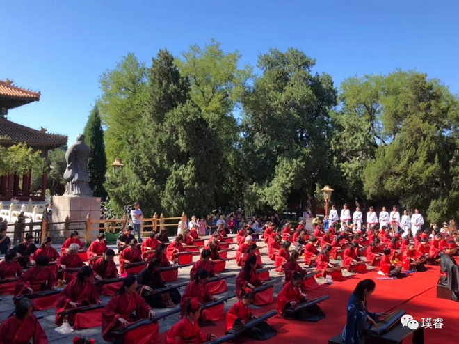 开幕式当天,由72名琴友在孔子像前席地而坐,手抚仲尼式古琴,整齐奏颂《至圣先师》古琴曲,时而悠扬悦耳,时而高荡起伏,场面壮观,重现孔子“弦歌不辍,诗三百五篇皆歌之”风范,堪为北京古琴文化史上的空前盛况!
